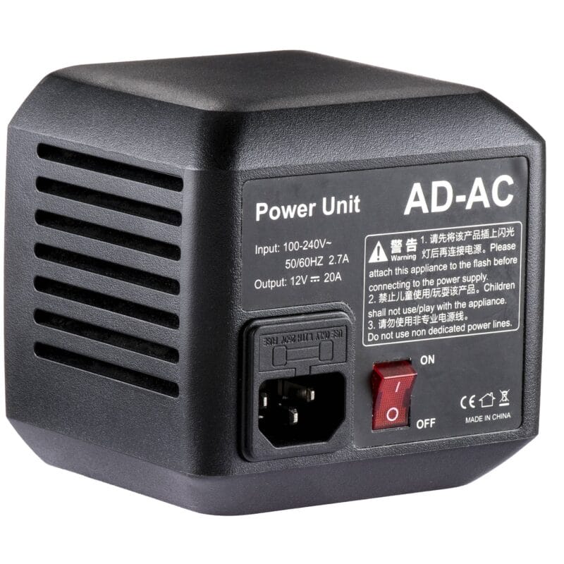 مخصص للضوء الأحادي Godox AD600 ، محول التيار المتردد 100-240 VAC هذا متصل بوحدة الفلاش ، بدلاً من البطارية ، للاستخدام مع طاقة التيار المتردد.