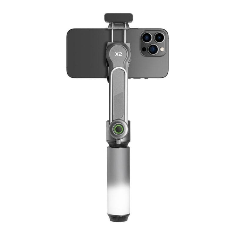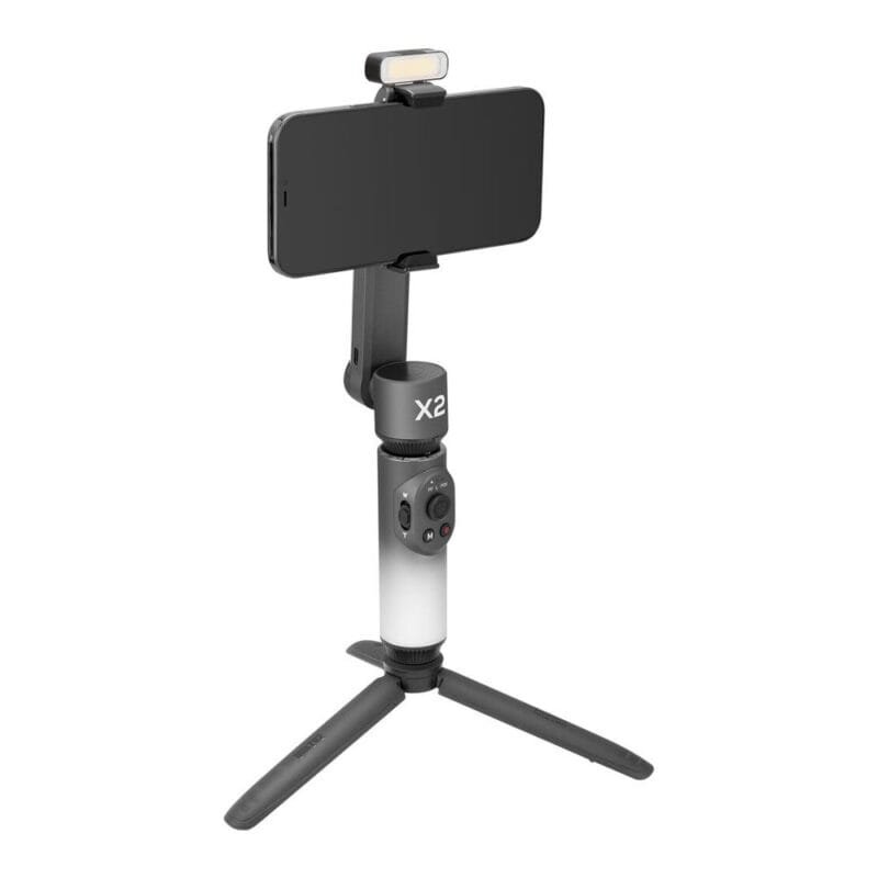 تتميز مجموعة Zhiyun-Tech Smooth-X2 الجديدة بتصميم أكثر إحكاماً وخفة مقارنة بسابقاتها، وهي أكثر توافقاً بفضل تصميمها القابل للطي. يتميز العمود القابل للتمديد في الأسفل بامتداد يبلغ حوالي 10.4 بوصة على خمس مراحل، مما يتيح لك تعديل المسافة للحصول على لقطات بزاوية عالية أو صور سيلفي. يمكنه الدوران بزاوية 360°، ويتيح لك وضع هاتفك أفقياً أو عمودياً للحصول على لقطات قياسية أو بورتريه. تتضمن هذه المجموعة أيضًا ضوءًا مغناطيسيًا للتعبئة، ومجموعة فلاتر لونية، وحقيبة حمل واقية.