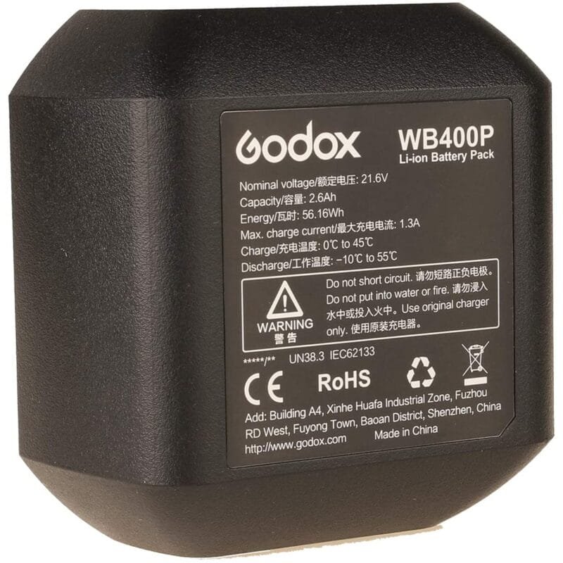 تنتج بطارية Li-Ion القابلة للتبديل الخاصة برأس الفلاش AD400Pro من Godox ما يصل إلى 380 ومضة طاقة كاملة ويتم شحنها بالكامل في غضون ساعتين.