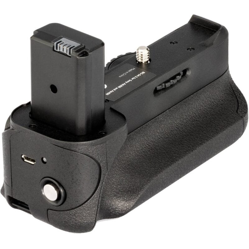 هو BG-S4-2 مقبض بطارية لكاميرات Sony Alpha a6100 و a6300 و a6400 Series من Vello ما يصل إلى بطاريتين NP-FW50 التي يمكن أن تضاعف وقت تصوير الكاميرا. كلتا البطاريتين قابلة لإعادة الشحن داخل المقبض عبر منفذ Micro-USB على المقبض. يتيح لك زر تحرير الغالق البديل التصوير بشكل مريح أثناء حمل الكاميرا رأسيًا وآمنًا باستخدام المقبض المطاطي المقاوم للانزلاق. بالإضافة إلى ذلك ، يمكّنك الحزام المثبت على المقبض من إرفاق حزام يد أو كتف. يتم تثبيت قبضة البطارية بسهولة على كلتا الكاميرتين بفضل الحامل الملولب 1/4 ″ -20 ، ومقبس تركيب ثلاثي القوائم 1/4 ″ -20 في الجزء السفلي من المقبض يسمح باستخدام حامل ثلاثي القوائم أو monopod مع الكاميرا.