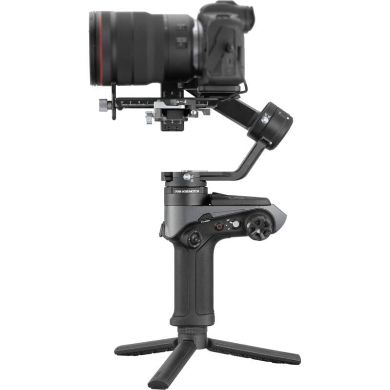 The iOS/Android mobile app offers features such as balance check, mode switching, and remote camera triggering for photo and video capture. For remote operation, the mini tripod allows you to set the gimbal down on a flat surface while you stand at a distance and operate the camera from your smartphone or tablet.