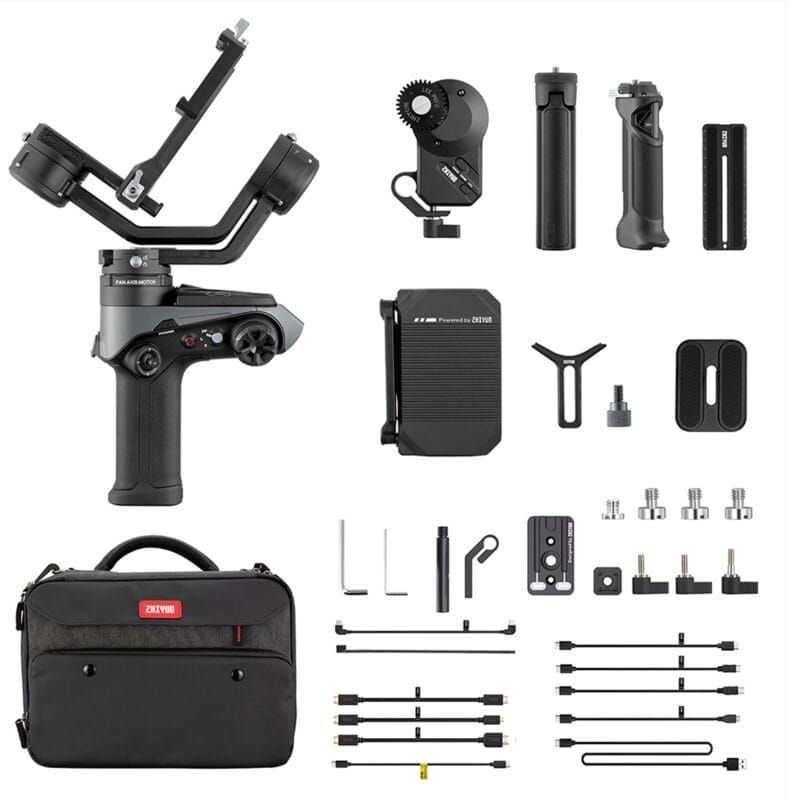 The WEEBILL-S Image Transmission Pro Package from Zhiyun-Tech includes the WEEBILL-S gimbal with everything it normally comes with, plus a wireless video transmitter, a lens motor, a smartphone holder, and HDMI cables for your image transmission workflow.