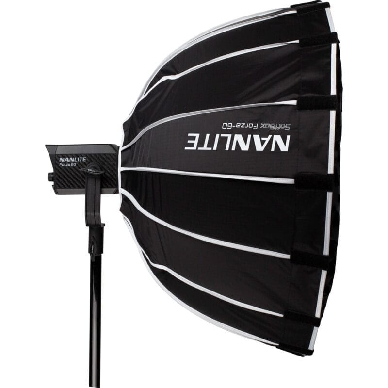 Ideal for portraits and interviews, the 23.6″ Forza 60 Softbox from Nanlite is a 16-sided light-modifier creating focused and soft light with punchy and crisp edges. This unique shape lends dimension and detail to your subject as well as natural-looking catchlights in their eyes, while the parabolic design of the modifier renders significant falloff at the edge of the subject for an enhanced degree of directional control, decreased spill light, and easy feathering. For additional dramatic control, the modifier also accepts separately purchased grids.