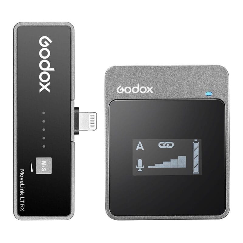 Godox MoveLink LT1 This compact, easy to use MoveLink LT1 wireless microphone system from Godox outfits budding Vloggers, Tiktok and YouTube personalities, or journalists with compact, digital audio recording tools for hands-free operation from up to 164′ away. The system includes one clip-on transmitter with integrated microphone, a lavalier microphone, a wind cap, and a smartphone-compatible receiver with a Lightning connector. With a built-in omnidirectional microphone in the transmitter, it can be clipped onto your subject for flexibility of recording. A magnetic iron sheet and a lavalier microphone give discreet options for microphone placement to maintain the aesthetic of your visual.